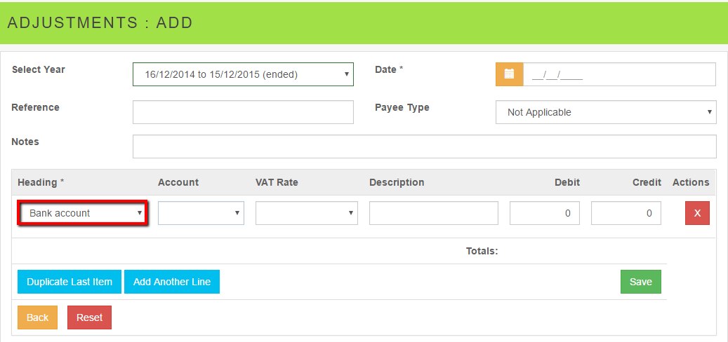 - Select the heading Bank Account