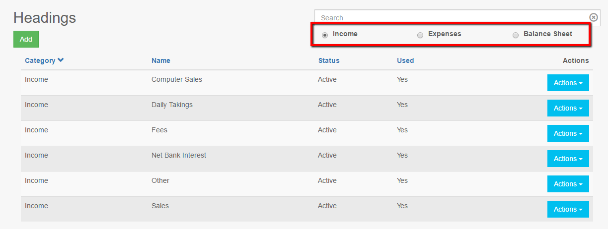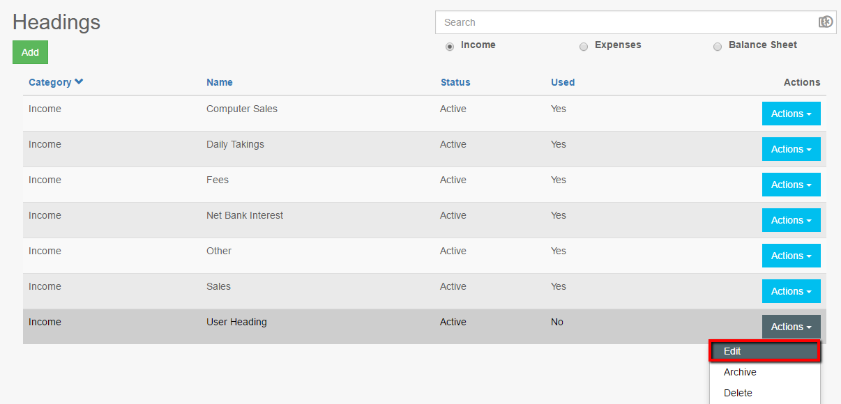 - Select the heading type to be amended; Income, Expenses, or Balance Sheet.