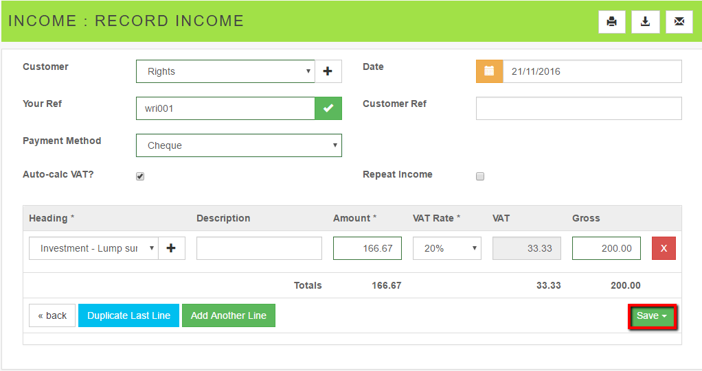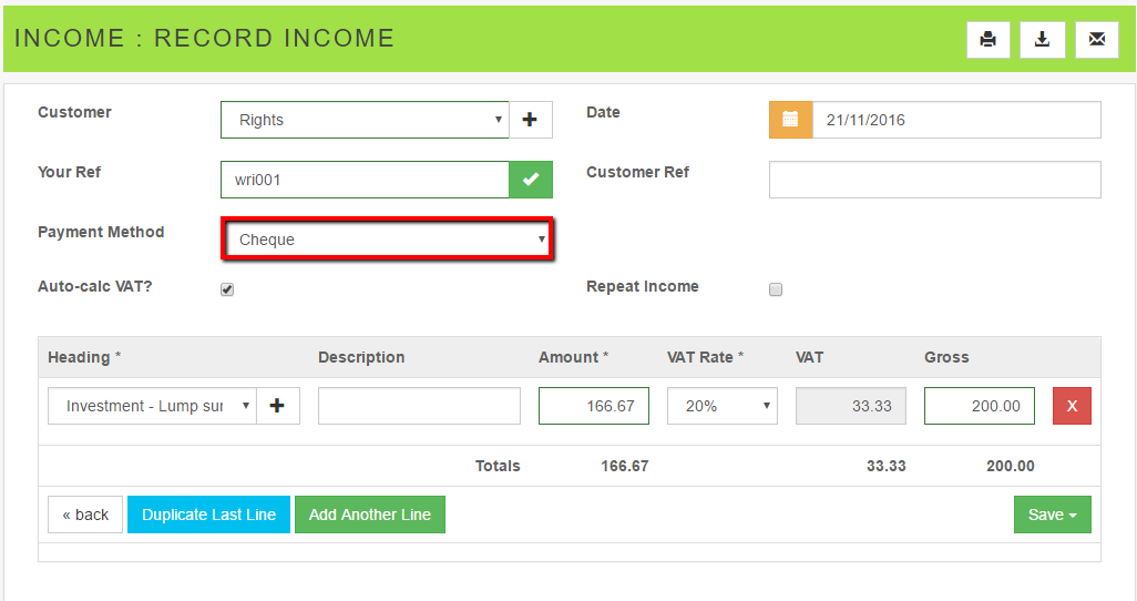 Record Income with Cheque as payment method