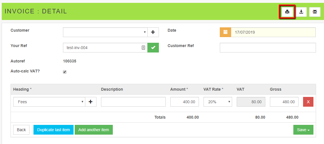 There is a Printer icon also provided on the transaction view/edit screen accessed by clicking the Pencil icon