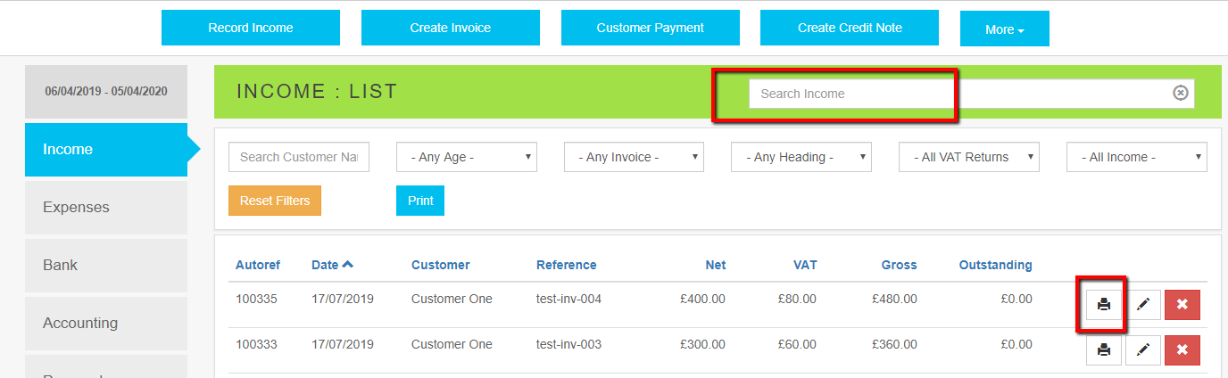 Click Income Find the transaction. Use the filters or search box to help find the transaction Click the Pencil view the transaction Print the transaction by clicking on the Printer icon