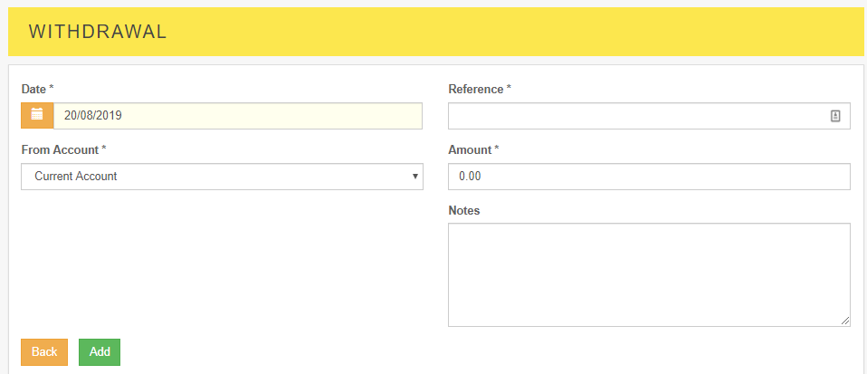 To take cash out of the bank and top up the petty cash tin use Bank Accounts, Withdrawal. This reduces the amount in the bank and increases the value of petty cash on hand. Complete the boxes, the asterisked boxes are mandatory and click Add.