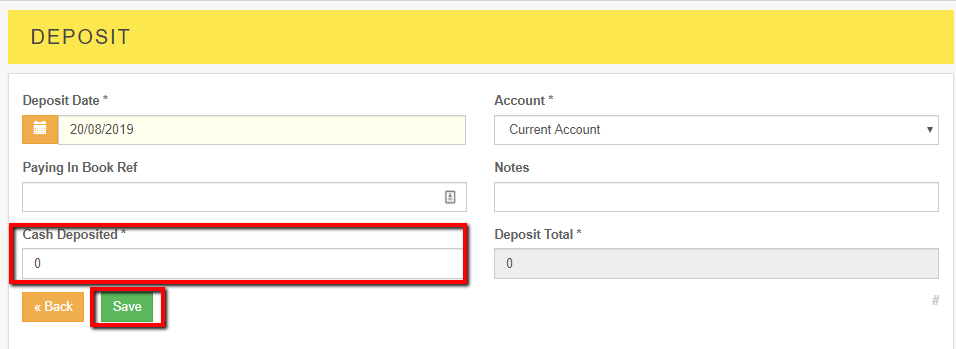If cash is banked select Bank Accounts, Deposit. The amount entered in the Cash Deposited box is used to increase the Bank balance and decrease the petty cash (cash on hand) balance. Complete the boxes, the asterisked boxes are mandatory and click Save.