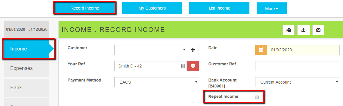 - Click Record Income