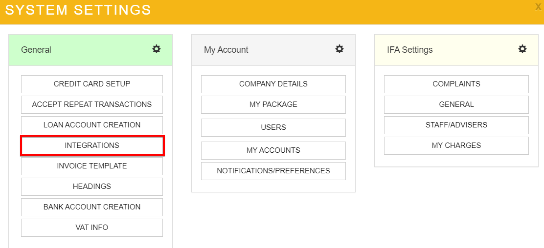 - Login to MyRegData at https://secure.gosimplebooks.co.uk/v2/ and from the Settings menu, choose Integrations