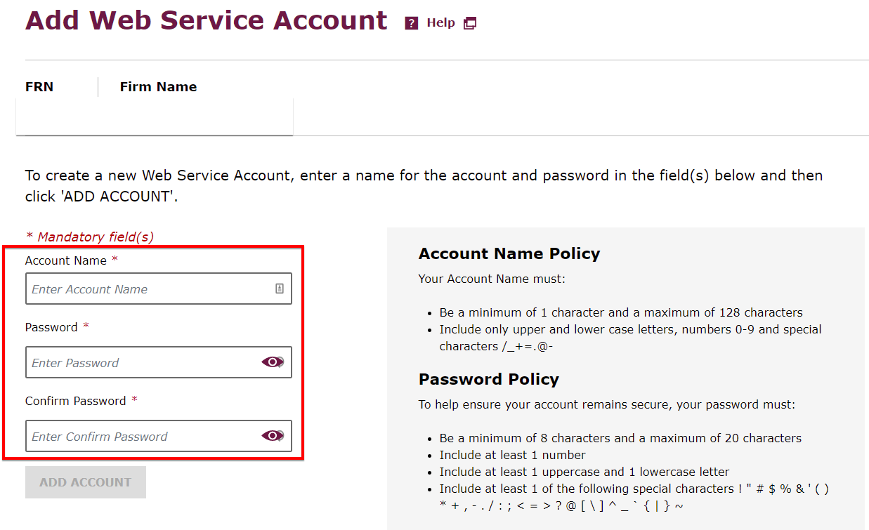 - Enter an Account Name (suggest firm FRN followed by MyRegData eg 123456MyRegData) and Password (note FCA policy guidance then click Add Account again
