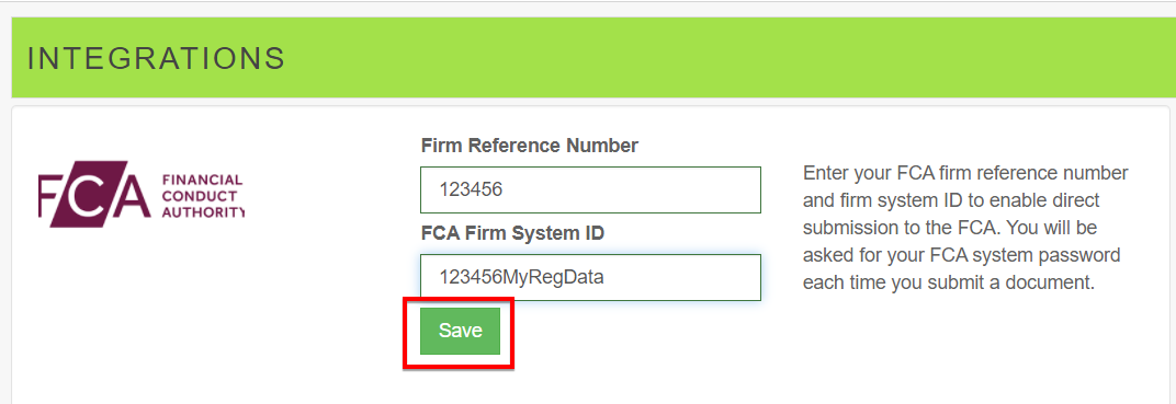 - Enter the Firm Reference Number and newly created FCA Firm System ID and click Save