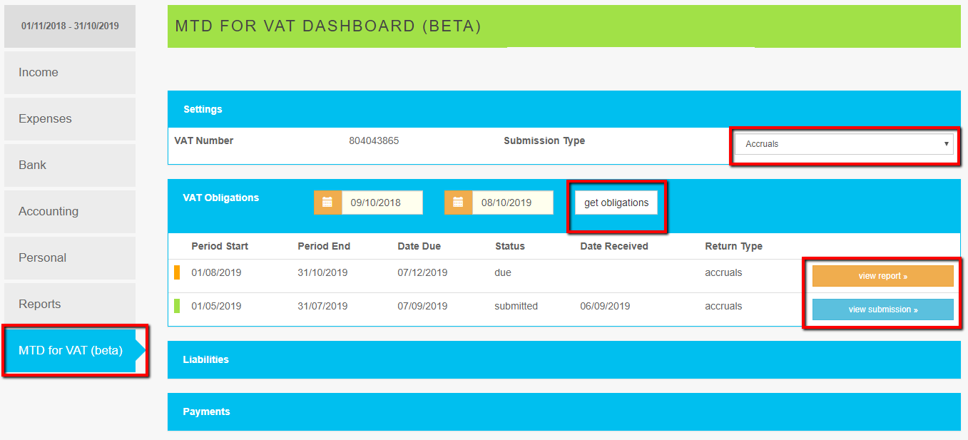 get obligations button to pull down VAT return information from HMRC - use it to refresh the information when necessary